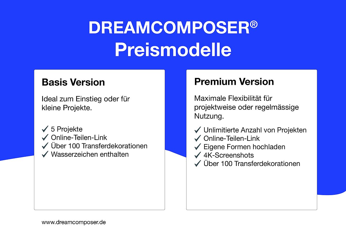 Mit dem DREAMCOMPOSER® verfolgt KURZ ein klares Ziel: Die kreative Hürde für Veredelungsdesign soll fallen – bei gleichzeitiger Steigerung der gestalterischen Qualität. Möchten Sie den DREAMCOMPOSER® erst kennenlernen oder ihn gleich in vollem Umfang in Anspruch nehmen? Das neue Modell-System macht beides möglich. Während die kostenfreie Basis-Version vor allem den Zugang erleichtert und für kleine Projekte ideal ist, bietet die Premium-Variante zusätzliche kreative Tiefe, mehr technische Kontrolle und erweiterte Exportfunktionen. Beide Versionen verfügen natürlich über die volle Bandbreite an KURZ-Transferprodukten und ermöglichen das Teilen von Projekten über einen Direktlink.